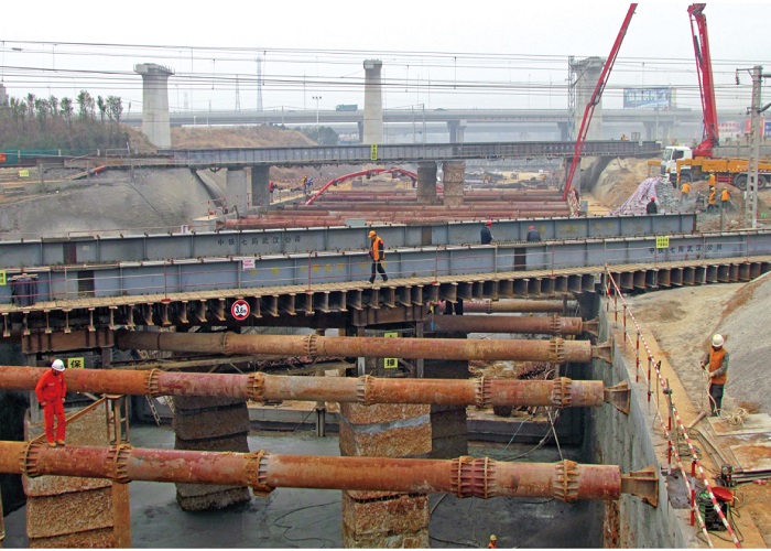 武漢市花城大道西段下穿鐵路隧道工程工程全長1440m,具有各段道路功能不一樣的特點,沿線穿越三環線、王青公路、武廣高鐵、武黃城際鐵路,武東鐵路編組站及武鋼鐵路編組場2個站場,線下基坑深、開挖難度較大,鐵路防護工程復雜等特點。該項目設計在全國范圍內首次實現運營線下的排樁+內支撐的深基坑支護結構。。