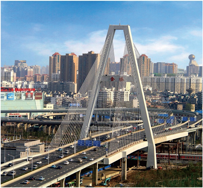武漢大道是橫跨武漢市漢口、武昌長江兩岸,設計時速60公里的城市快速路。全長近44公里。武漢大道控制性工程——金橋大道跨京廣鐵路橋,為一座獨塔雙索面預應力混凝土箱梁斜拉橋,“一步”跨越武廣高鐵、京廣和合武鐵路,從12條鐵路線上騰空而過。“金橋”以其獨特的設計理念創同類型跨鐵路斜拉橋中橋面最寬、塔體最高、跨度最大三項國內紀錄,成為武漢大道最靚麗的一道風景,為橋都武漢再添一顆璀璨的明珠。